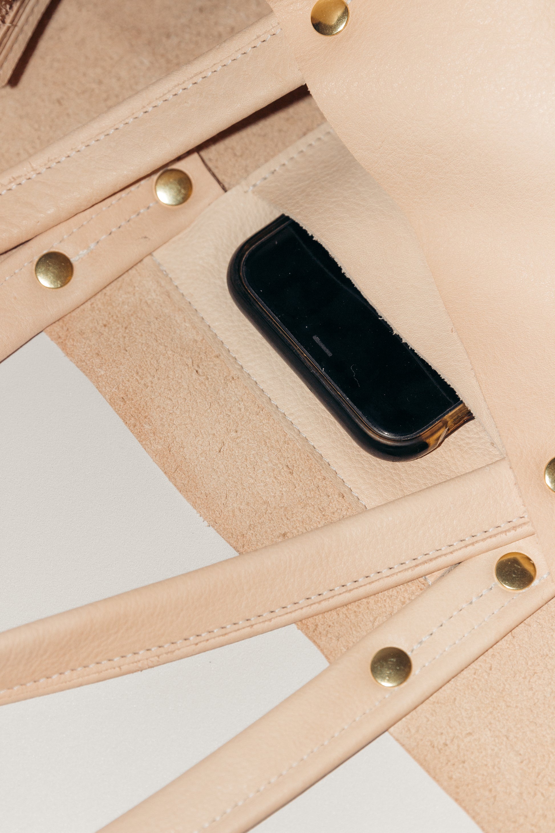 Our Leather Tote updated with premium natural vegetable tanned leather. The interior is unlined, large, and spacious. Features an interior zip and slip pocket. The straps are rolled, stitched, and attached with brass rivets. The leather is stiff and will soften with wear. It is slouchy and can be folded up for travel. Comes with a fabric dust bag.